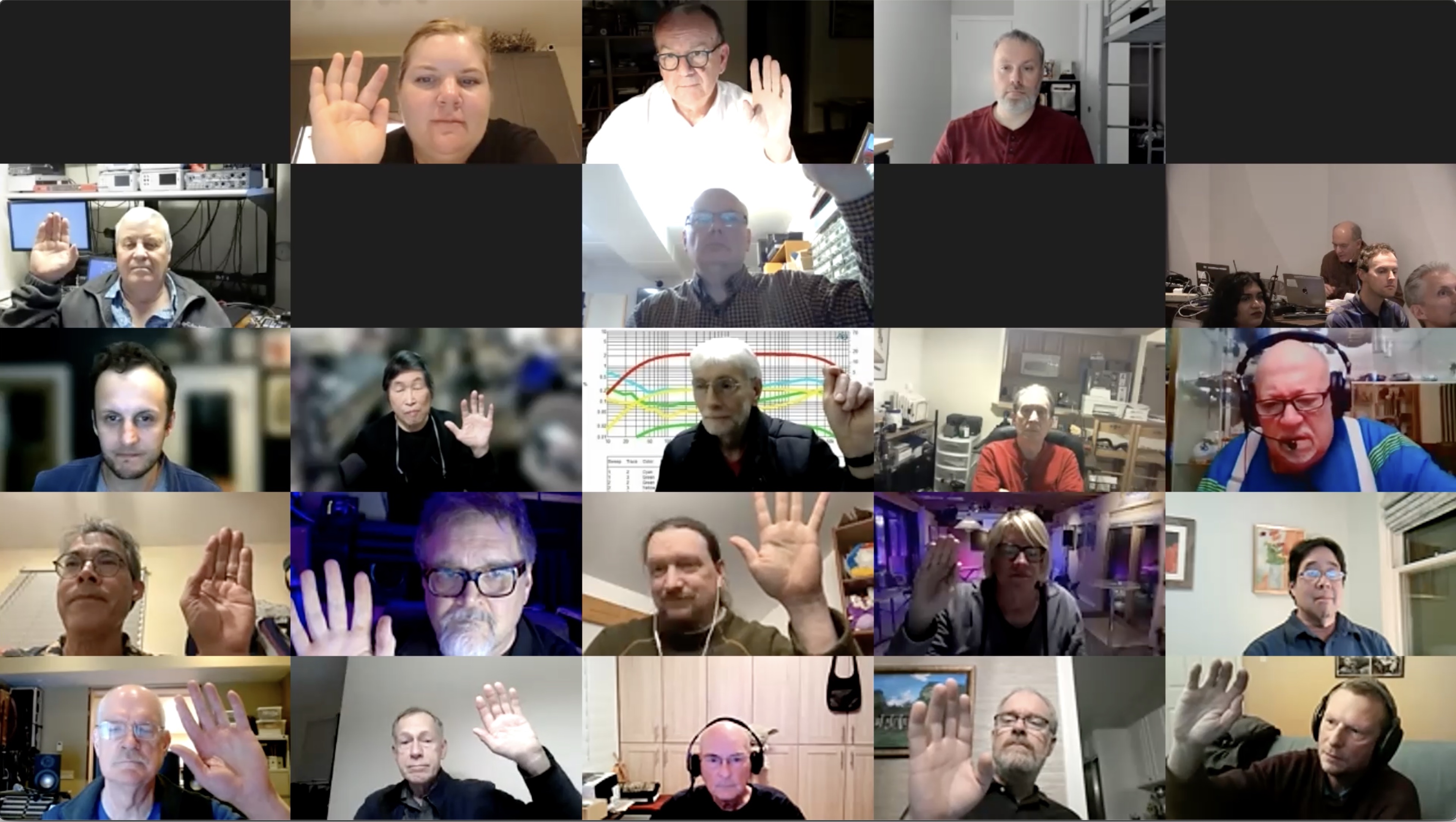demonstrating absolutely free software for testing audio gear. Since he was on the east coast USA, the meeting was Zoom but with PNW locals invited to a "viewing party" at the Seattle studios of Jack Straw Cultural Center and post-event no-host dinner. Suitable mics, cameras and speakers allowed participation by all. About 17 people came in person (7 AES members) and 47 on Zoom (33 AES members).