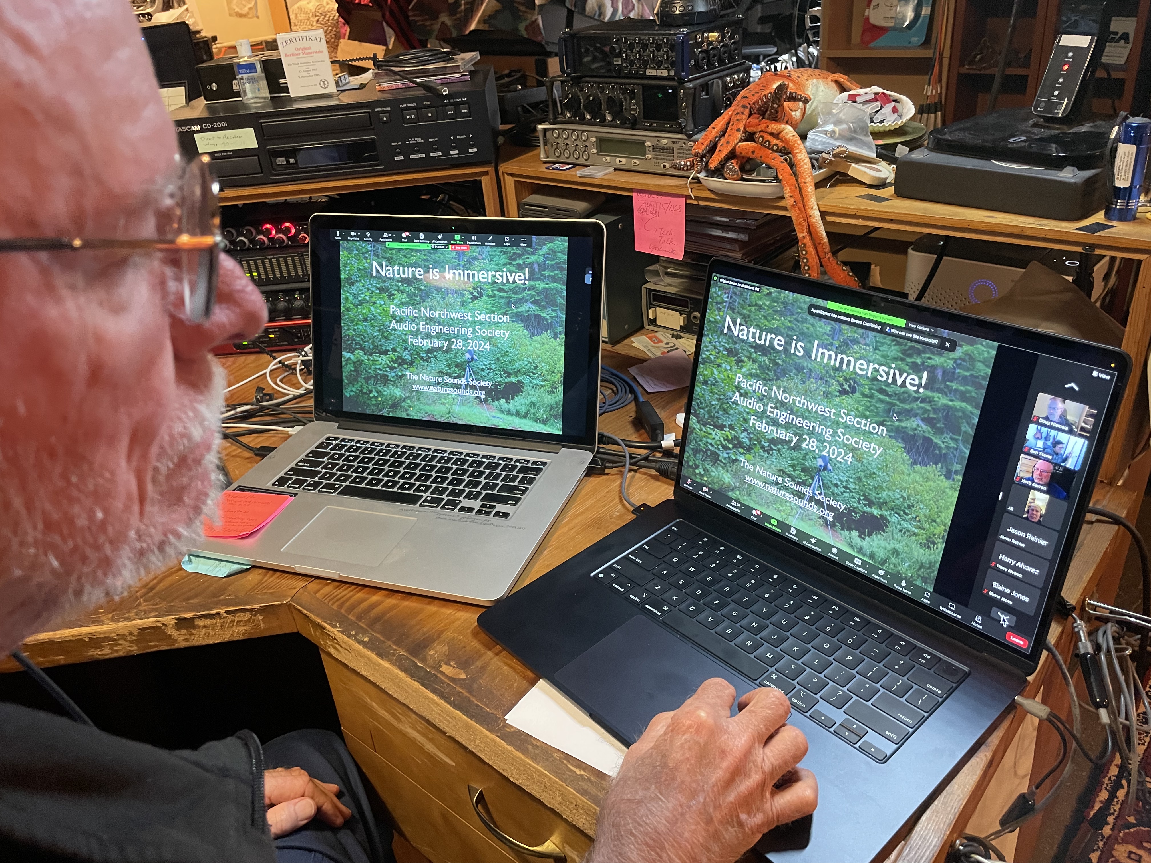 The PNW Section held its February meeting on Zoom and featured automixer expert Dan Dugan in a different role - nature sound recordist. Speaking from his San Francisco headquarters, Dan spoke about his work in the Nature Sounds Society and with the U.S. National Park Service (NPS), recording the sounds of nature. Many examples were played, many in surround converted to binaural. Some 71 persons attended on Zoom, with the percentage of AES members unknown due to a ticketing glitch. Historically on average, 60% are members.